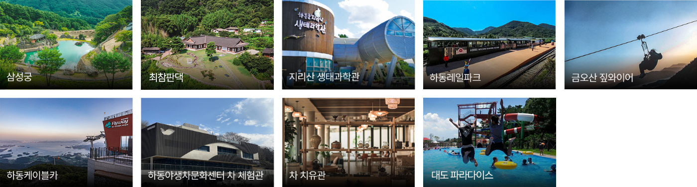 삼성궁, 최참판댁, 지리산 생태과학관, 하동레일파크, 금오산 짚와이어, 하동 케이블카, 하동야생차문화센터 차체험관, 차치유관, 대도 파라다이스