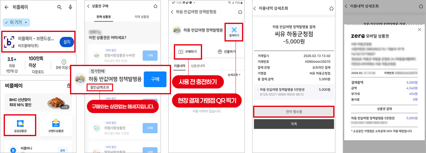 - 4. 제로페이 이용내역의 전자영수증 캡처(하동반값여행 정책발행용 결제 문구가 포함된 캡처본)
