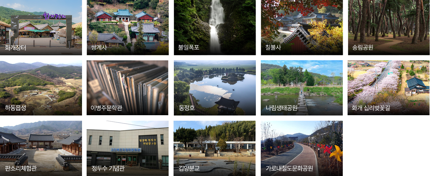 화개장터, 쌍계사, 불일폭포, 칠불사, 송림공원, 하동읍성, 이병주문학관, 동정호, 나림생태공원, 화개 십리벚꽃길, 판소리 체험관, 정두수 기념관, 김양분교, 가로내철도문화공원